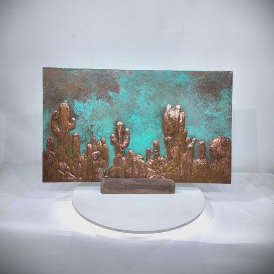 - Handmade Copper Craftsmanship — embossed cactus design with verdigris green patina