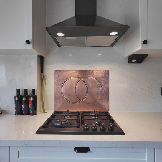 The Eclipse Copper Backsplash is a modern geometric design handmade from real copper. Featuring two overlapping circles embossed into the panel, it symbolizes balance and harmony while adding a bold artistic statement to your kitchen. Finished in natural copper, it highlights the warmth and timeless appeal of the metal.