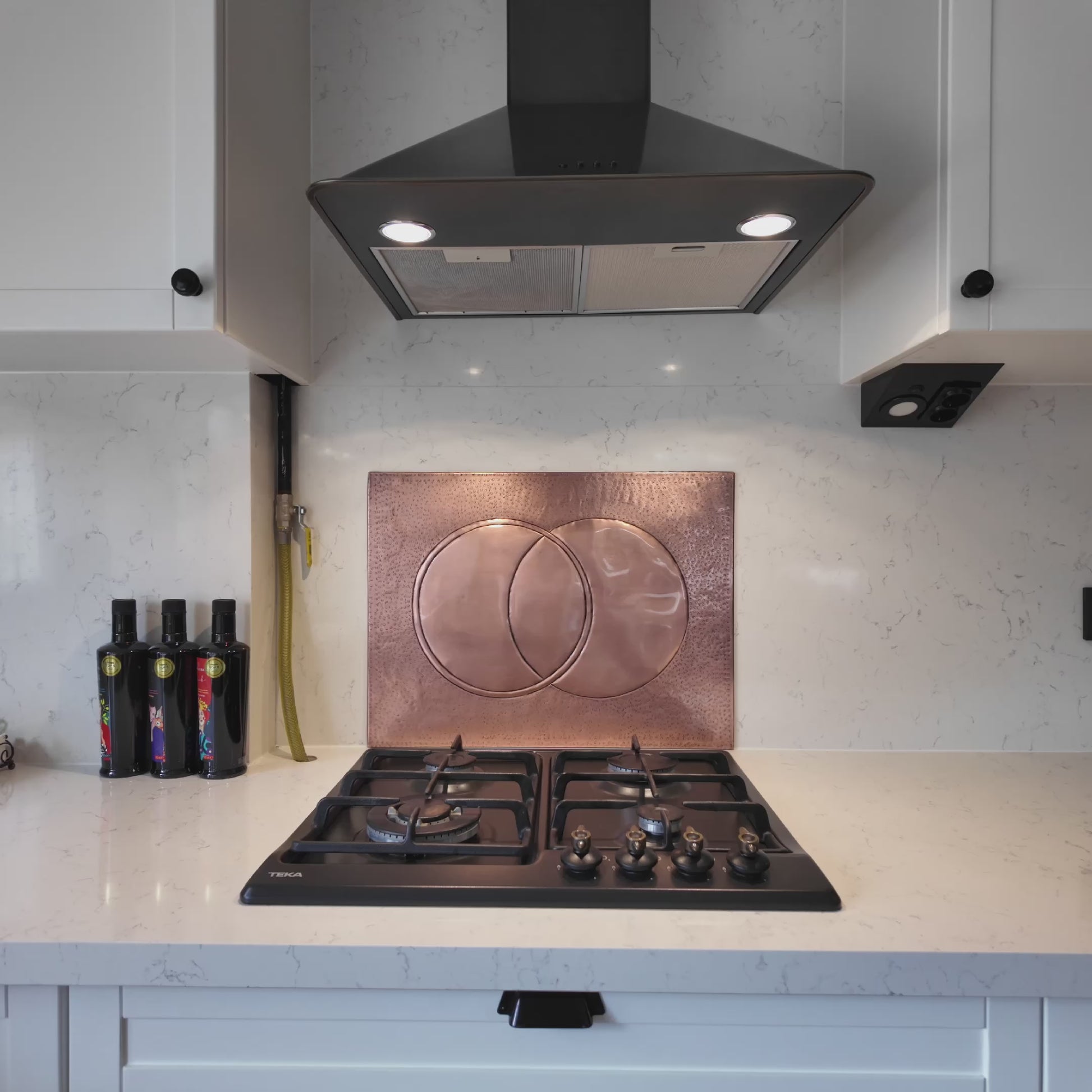 - Handmade copper backsplash with embossed Eclipse circle design