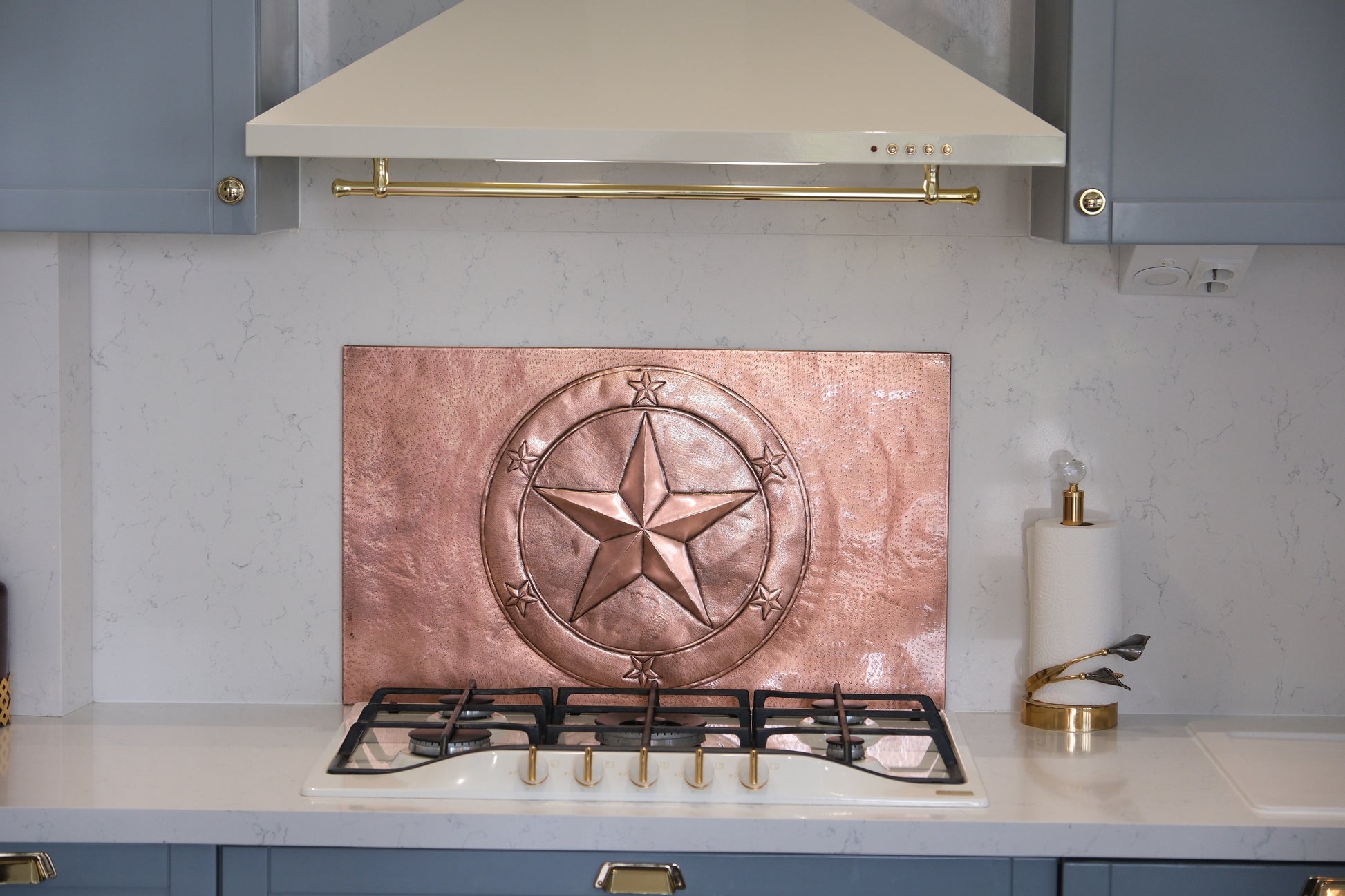 Lone Star Copper Backsplash is designed to honor Western tradition while embracing a modern aesthetic. Featuring an embossed relief of the iconic Lone Star, surrounded by rustic Western flourishes, this backsplash symbolizes heritage, resilience, and timeless craftsmanship, making it a perfect addition to farmhouse, ranch, and modern rustic kitchens.