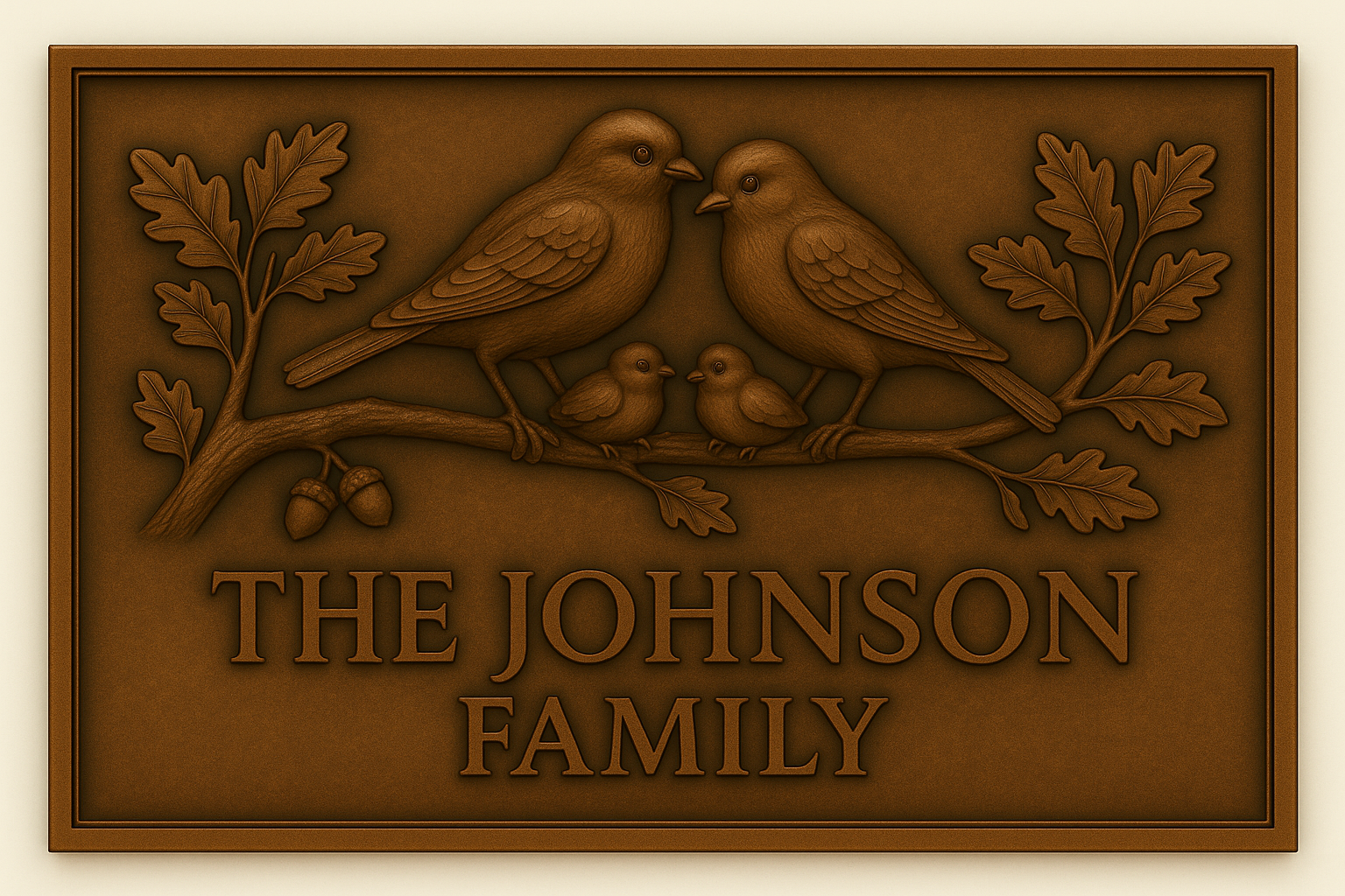 Celebrate love and family with the Bird Family Name Sign. Embossed with two parent birds perched on an oak branch alongside two chicks, this design symbolizes unity and togetherness. Acorns and oak leaves frame the scene, while your family name is prominently displayed below. Perfect as a centerpiece in kitchens, living rooms, entryways, or as a heartfelt gift for loved ones.