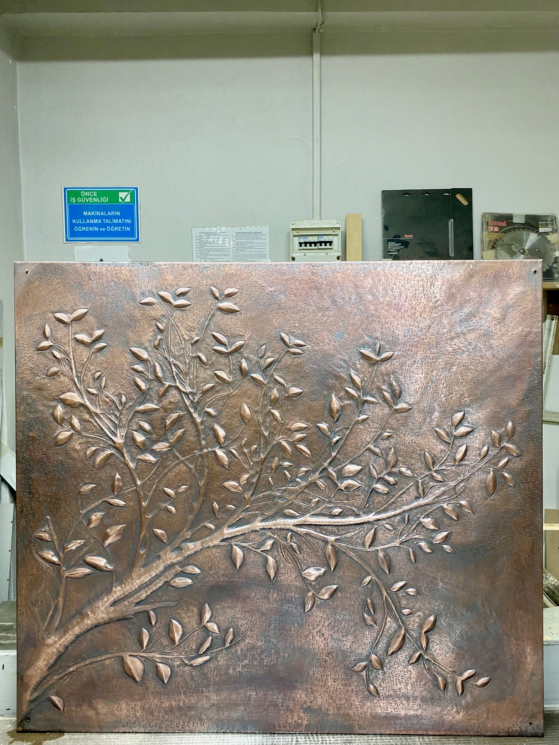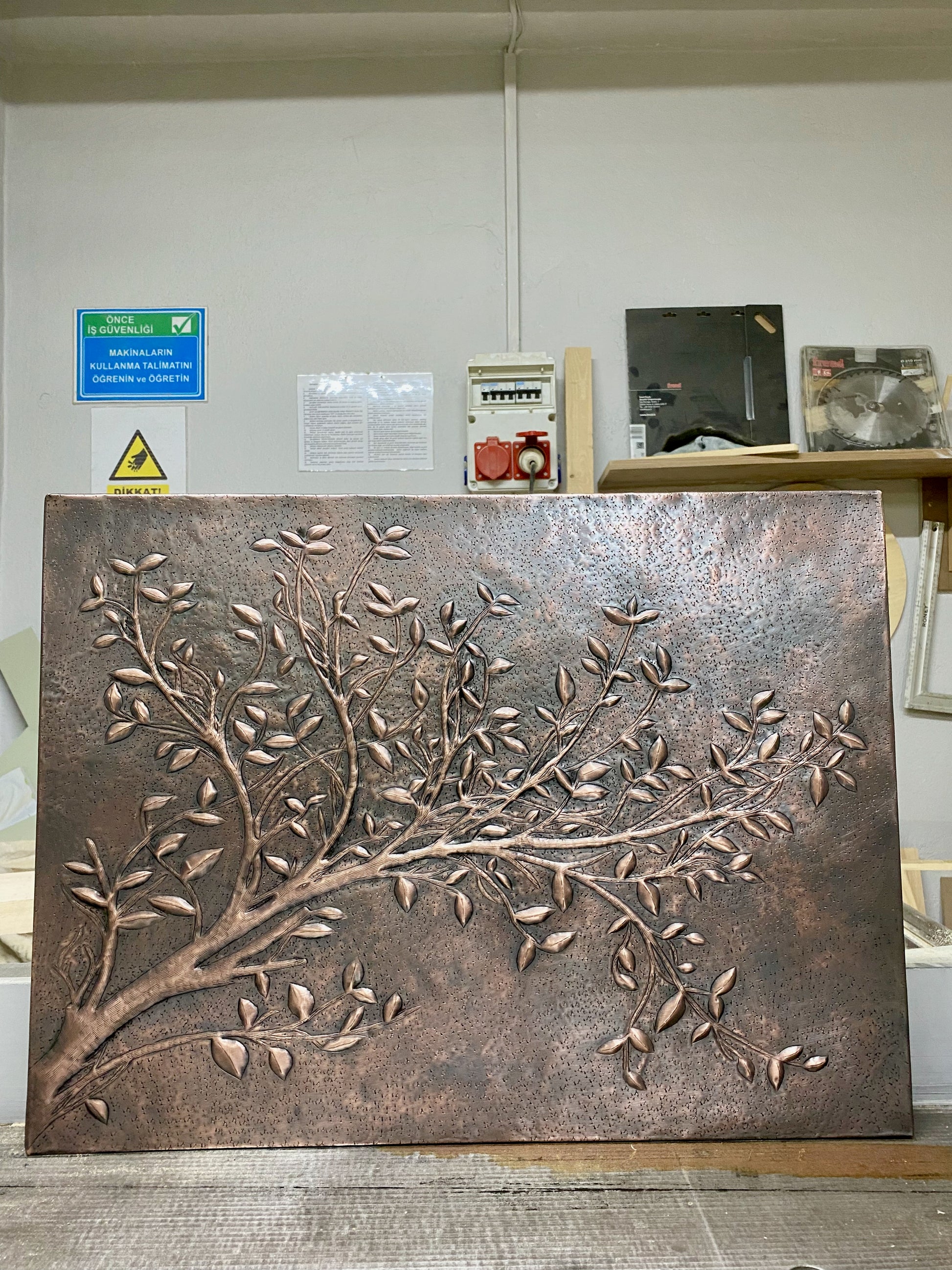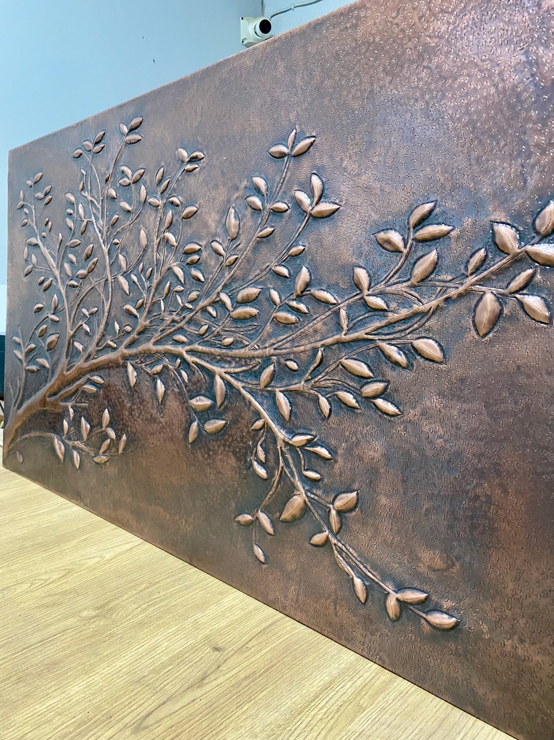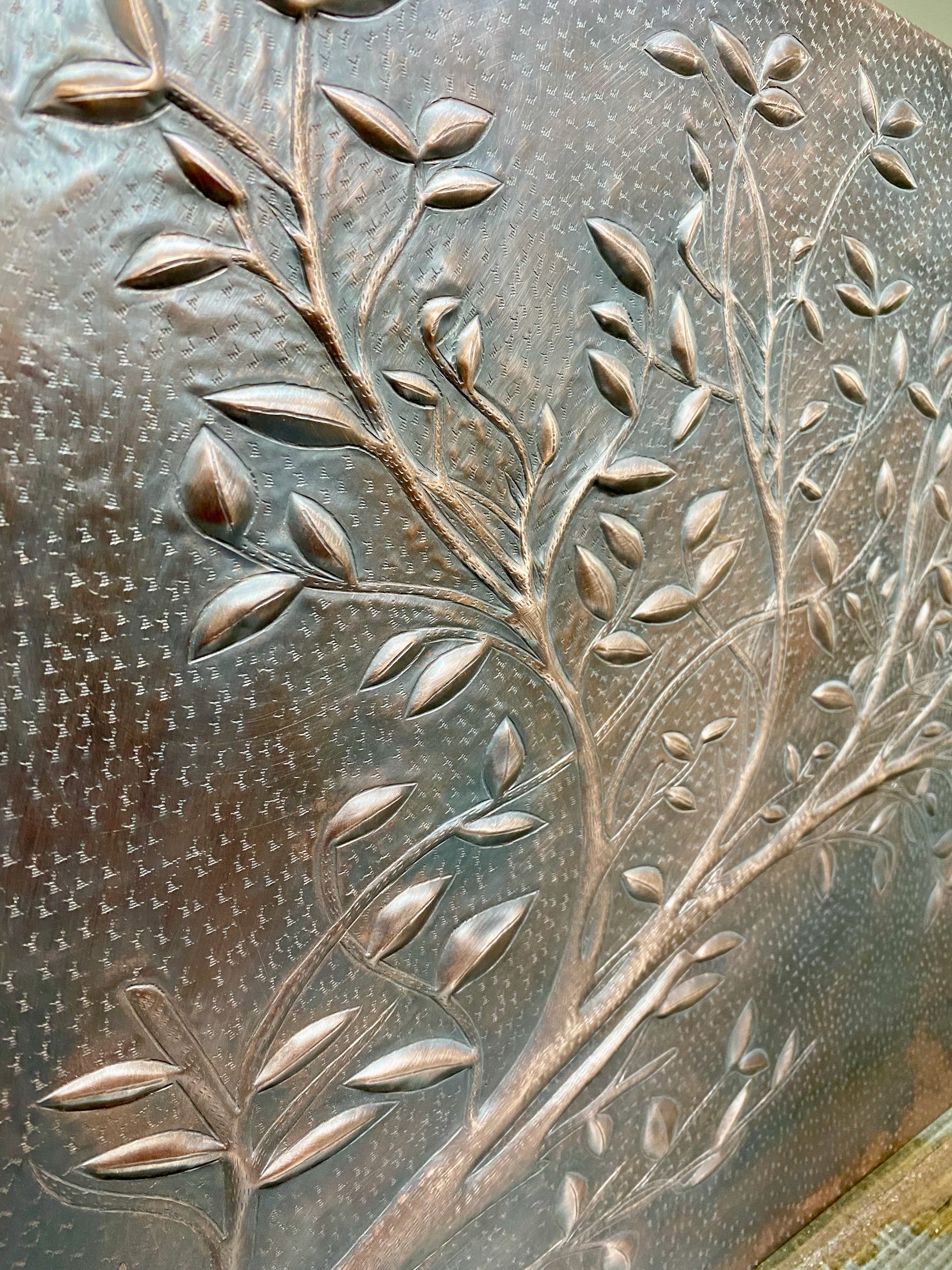 - Embossed copper tree branch design with rustic brown patina